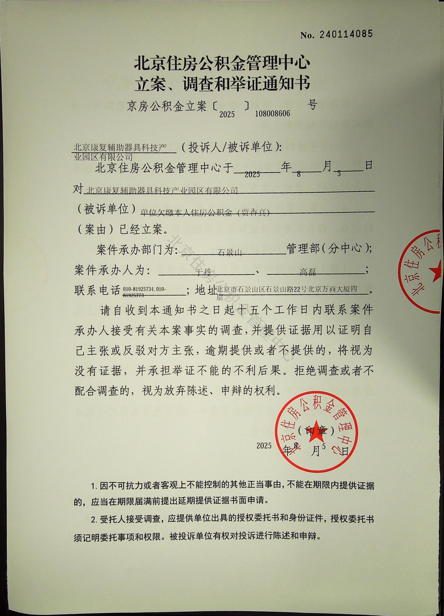 附件:《北京住房公积金管理中心立案、调查和举证通知书》(京房公积金立案〔2025〕108008606号)
