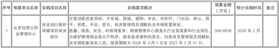为便于供应商及时了解政府采购信息,根据《财政部关于开展政府采购意向公开工作的通知》(财库〔2020〕10号)等有关规定, 现将北京住房公积金管理中心2026年部分采购意向公开如下: